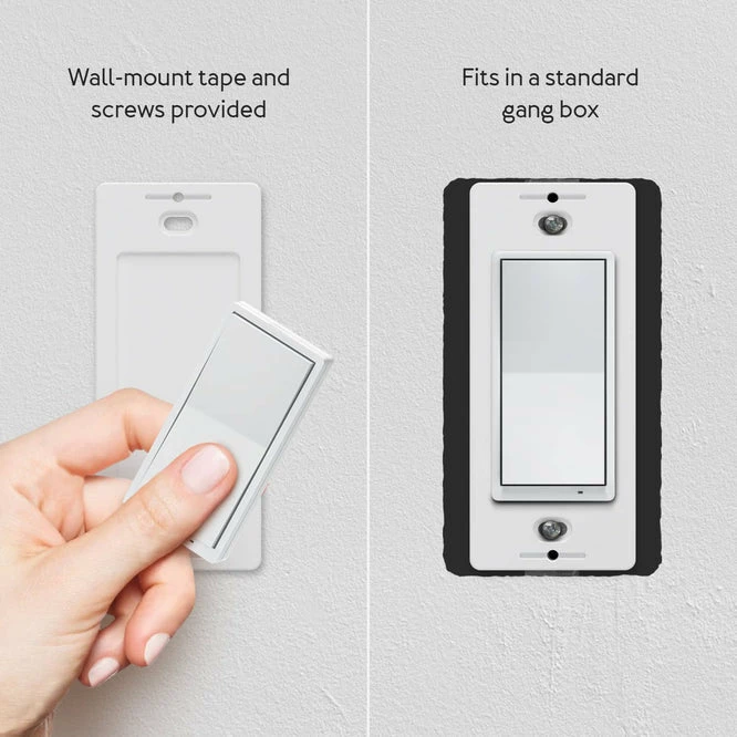 Battery powered Z-Wave remote control designed to look like a regular light switch. This Z-Wave remote control can be used to easily add a light switch or dimmer to any location in your home to control smart lighting. This versatile smart remote can also be used as a scene controller.