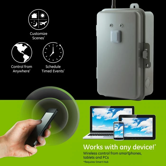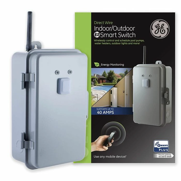 Transform any home into a smart home with the GE 40 Amp Z-Wave Plus Direct-Wire Indoor/Outdoor Smart Switch. When added to a Z-Wave network, the heavy-duty GE smart switch enables wireless control of on/off functions for large load, hard-wired applications such as waters heaters, landscape lighting, spas, pool pumps and heaters. The GE Z-Wave Outdoor Smart Switch can be used indoors or outdoors and features an easy-access wire connection block, front-mounted LED lights indicating power and on/off status, and an override switch to turn connected devices on or off manually. The Outdoor Smart Switch is housed in a lockable, tamper-resistant case to ensure settings and wiring are secure. The rugged, weather-resistant design will keep out dirt and debris while being suitable for use in extreme weather conditions