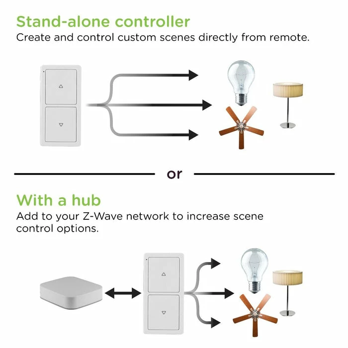 - NO HUB NECESSARY – The remote allows you to create one scene to control smart devices with or without a Z-Wave hub. It is able to directly pair with Z-Wave switches, dimmers, fan controls and more simple-setup home automation. Dual- and quad-scene models – 34174 and 34176 – are also available for even more varied automation.