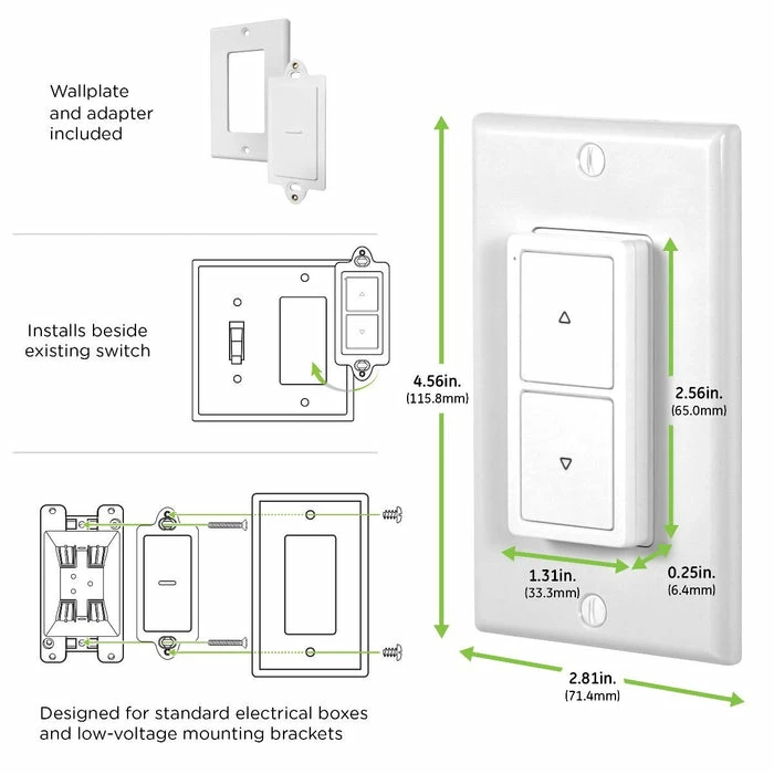 - VERSATILE PLACEMENT – Compact construction and two provided CR2032 batteries offer comfortable handheld operation for easy portability. The included unique magnetic adapter and rocker-style wallplate support wall-mount options. The remote can also be incorporated into existing switchboxes and multi-gang setups or replace blanks. Tabletop placement with an available cradle – model 39943 – allows convenient accessibility anywhere.