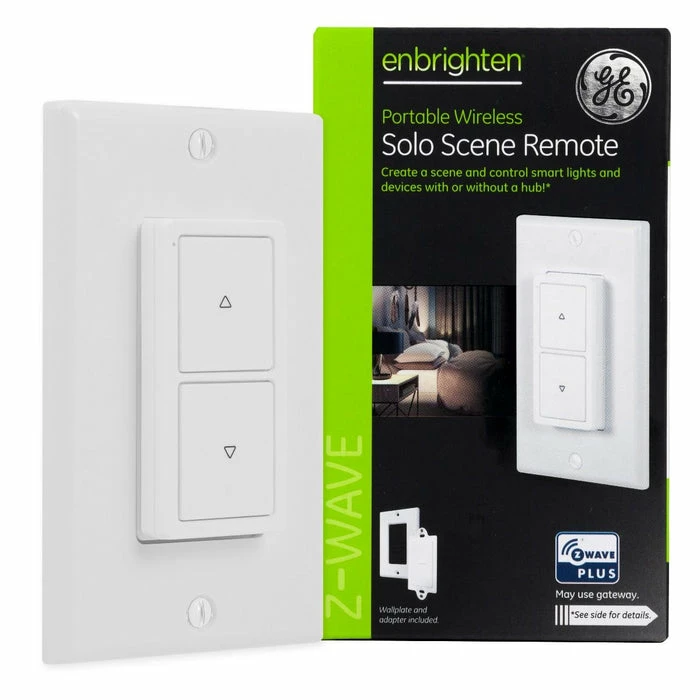 Expand your control with the GE-branded Enbrighten Z-Wave Plus Portable Solo Scene Remote. The battery-powered smart remote works with Z-Wave devices to create one-touch scene control to wirelessly operate lamps, fans, water features, seasonal lighting, and more for effortless management of your home. A hub is not required, but the scene remote works perfectly with gateways from many top brands for enhanced versatility.